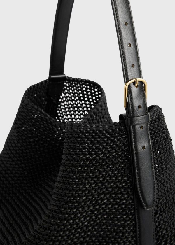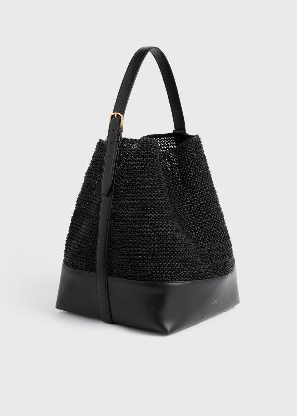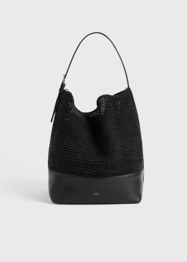 TOTEME tote bag artisanally hand-woven in Italy from supple leather. It has an adjustable strap with a gold-tone metal buckle matching the Slim trouser leather belt and opens with a small clasp to a spacious interior with a square base. Carry it alongside everyday edits.