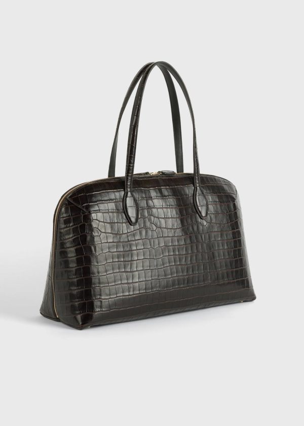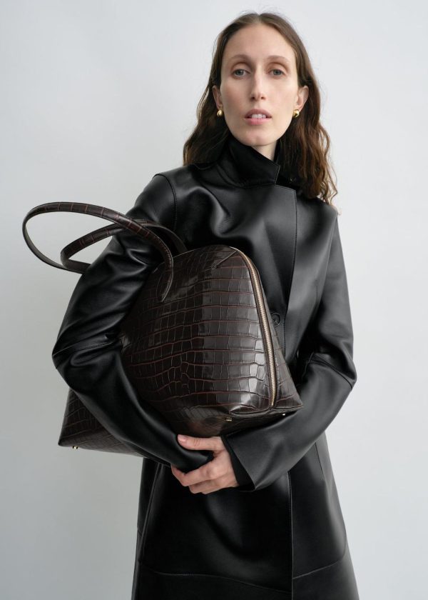 Designer’s note: “This new TOTEME Garderob tote was imagined for busy schedules spanning work meetings, gym workouts and travel. Made in Italy from croco-embossed leather, it has a zipper opening through the sides to reveal an expansive interior with a slip pocket. Carry it throughout the day alongside a trench.”