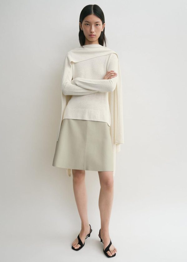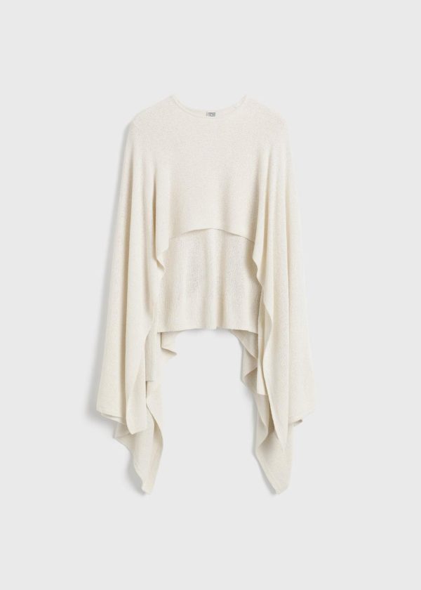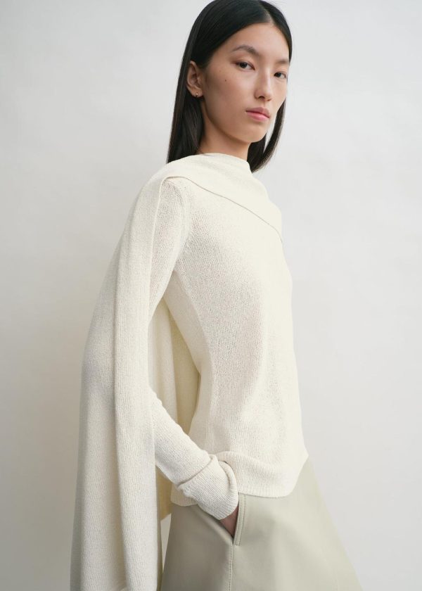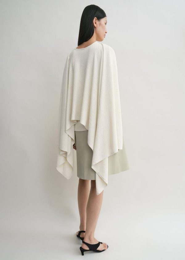 Long-sleeved TOTEME sweater featuring a matching cape attached at the neck. It is knitted from voluminous bouclé made from dense silk fibers with a loose slim silhouette. Let it drape over a skirt for a day event.