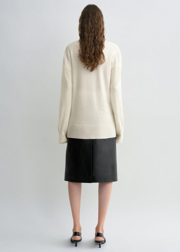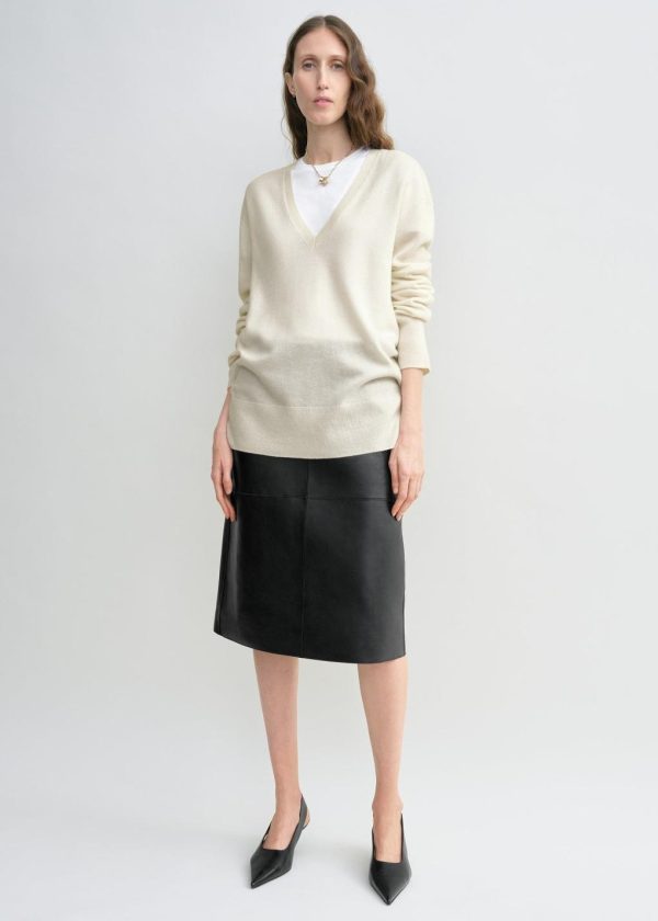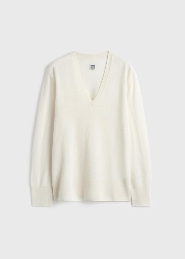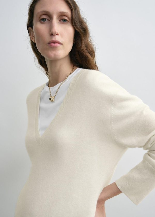 Designer’s note: “This TOTEME Garderob cashmere knit has been reimagined with a relaxed, elongated silhouette and a deep V-neckline that reveals a hint of skin. Wear it as a fine, soft layer on chilly summer evenings or style it over a white crew-neck tee as a considered contrast.”