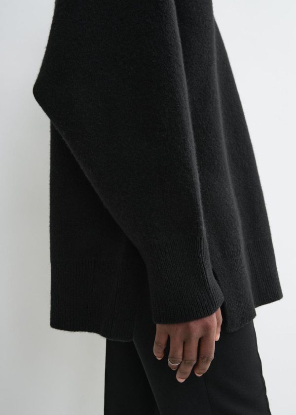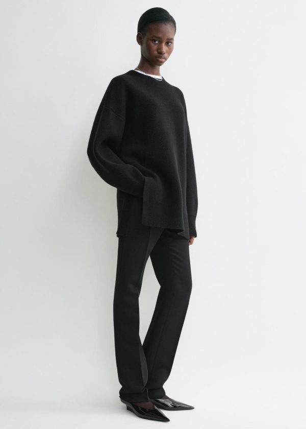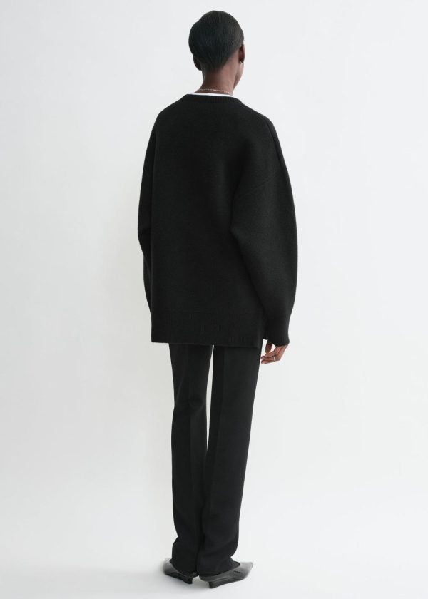 Longline TOTEME crew-neck sweater double-knitted to an inverted trapeze silhouette with low and spacious armholes channeling a relaxed mood. It is made from certified wool infused with a soft touch of cashmere and has a discreet monogram embroidered onto the sleeve. Note how the side-hem slits allow it to drape effortl