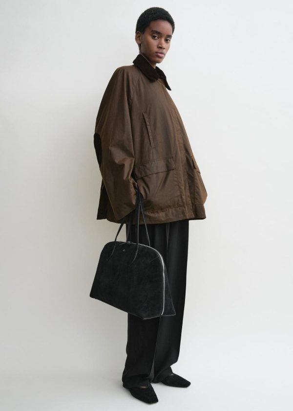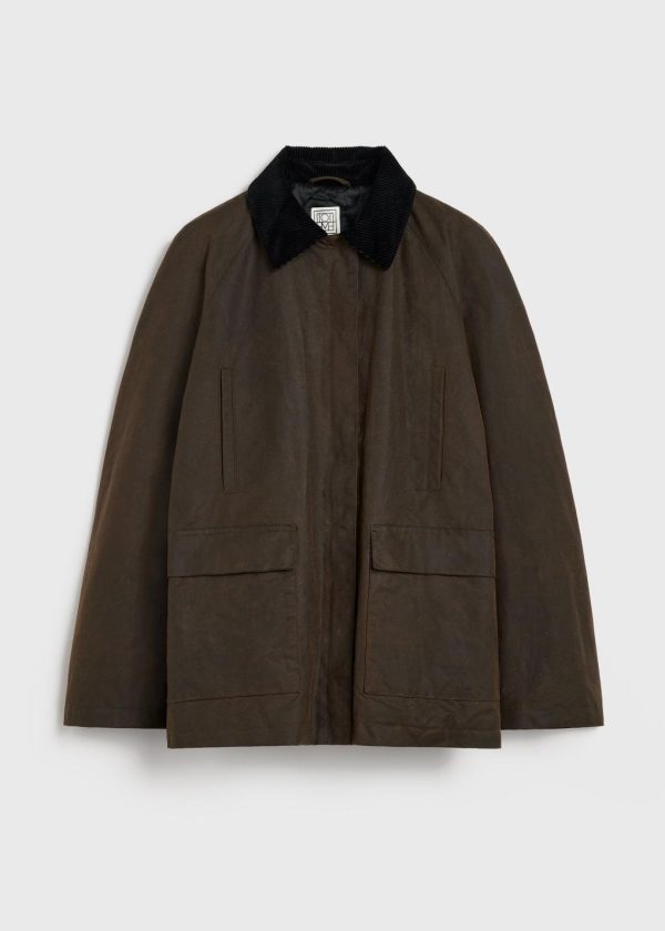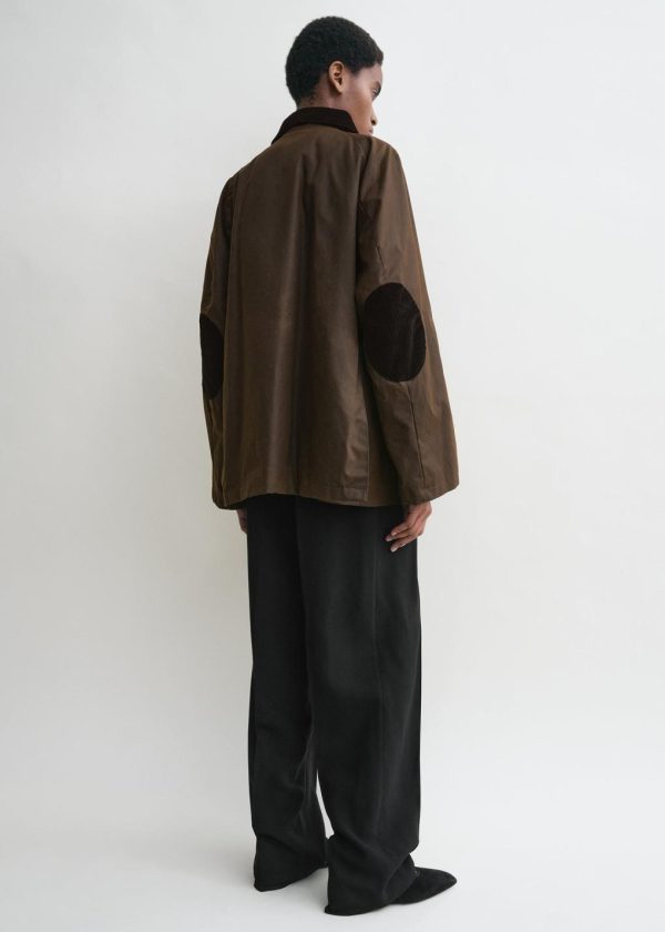 Oversized TOTEME jacket made from waxed cotton sourced from British heritage weavers and dyed in a new brown shade named bark. It has a very spacious A-line silhouette accented with a black corduroy collar and elbow patches, a zipper and press-stud front, multiple front pockets, and two back vents. Wear it as intended