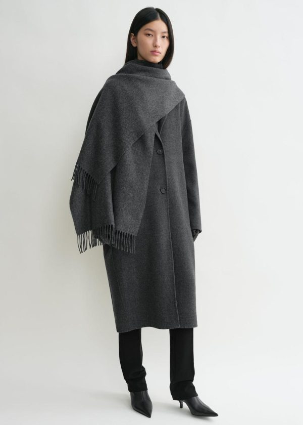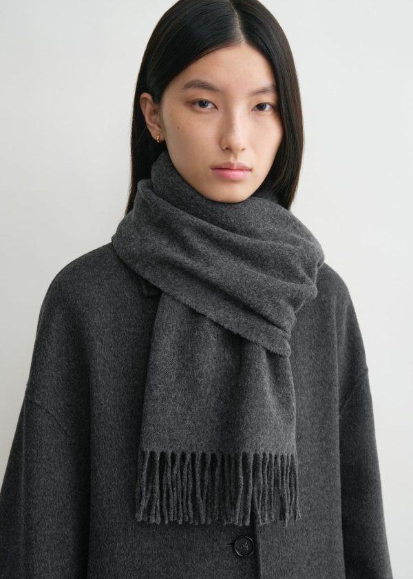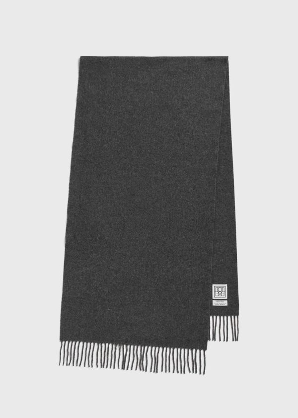 Classic TOTEME scarf made in Italy from responsibly sourced wool. It has a rectangular shape measuring 220x50cm with fringed edges and a monogram label. Wear it throughout winter over your favorite coat or jacket.