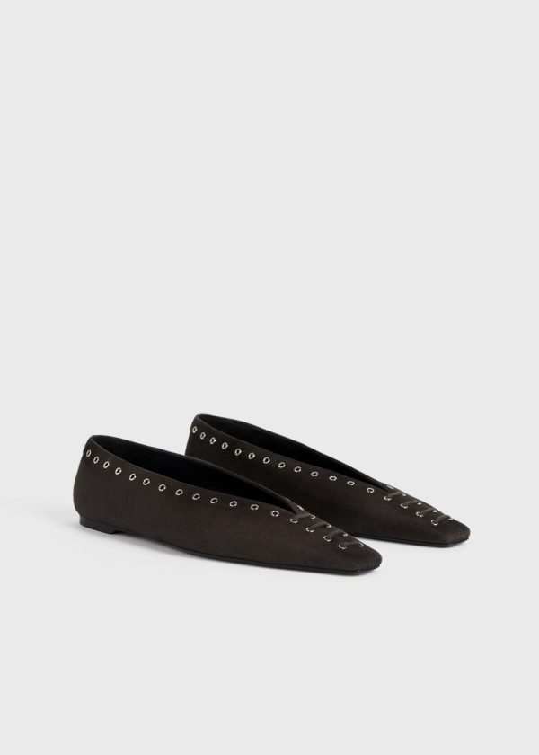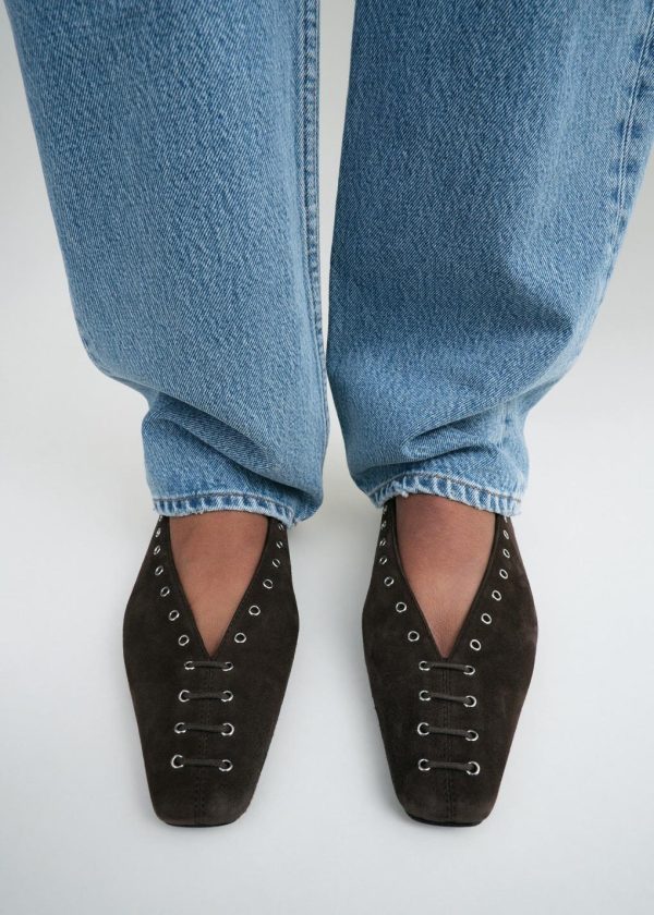 TOTEME ballerina flats set with silver-tone metal eyelets and decorative laces. They are made in Italy from suede lined in supple leather and are set with a cushioned insole and soft heel counter for comfort. Wear them throughout the week with jeans.