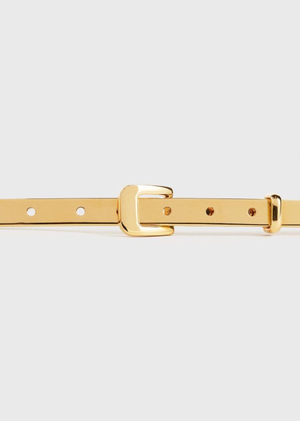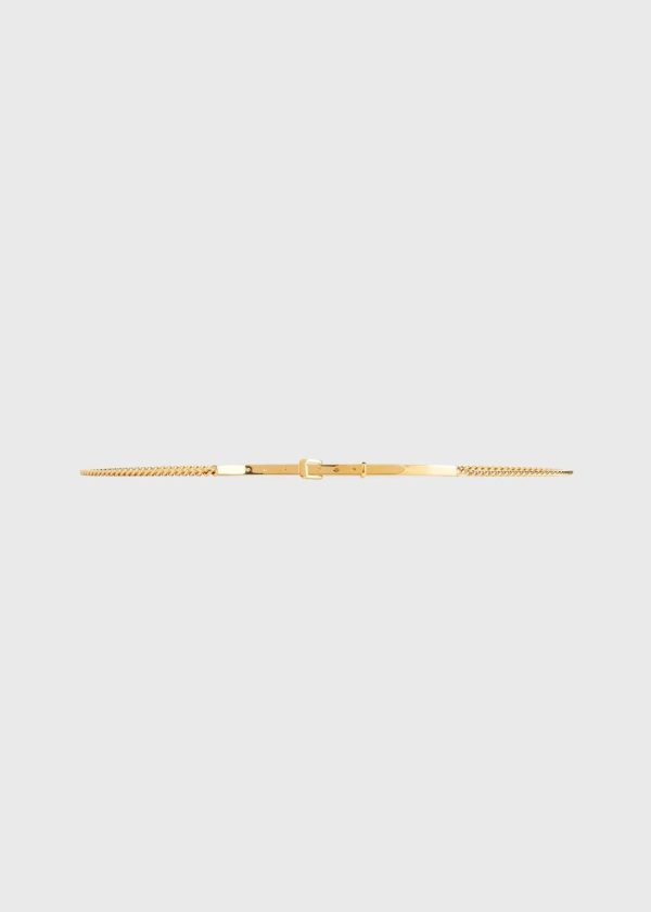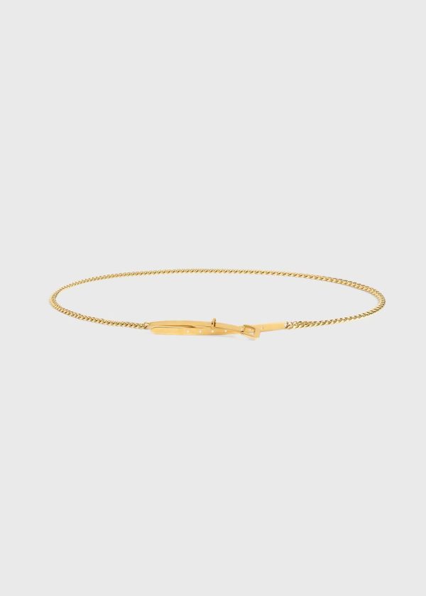 Directional TOTEME belt crafted in Italy from shiny gold-plated brass. It consists of a slim curb chain set with rigid edges where the matching buckle can be adjusted to different sizes. Let it stand out over dark separates.