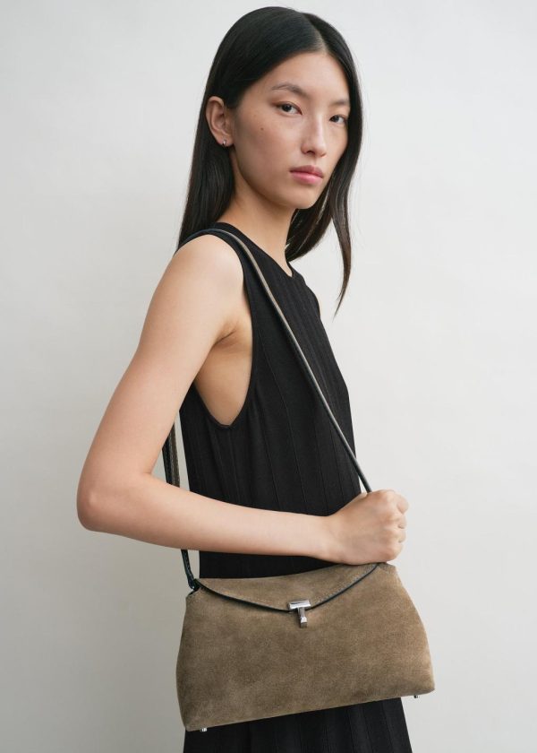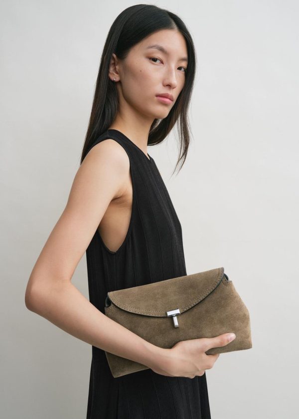 Sculptural TOTEME clutch bag named T-Lock after the silver-tone metal twist lock securing the curved top flap. It is crafted in Italy from structured suede and opens to a tonal interior fitted with a card slot. Hold it in your hand or carry it across the body using the optional strap.