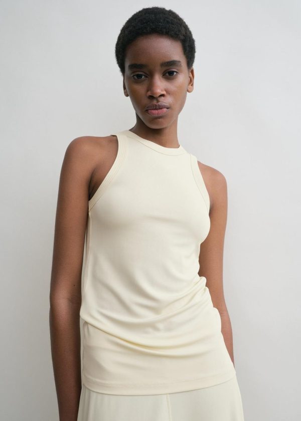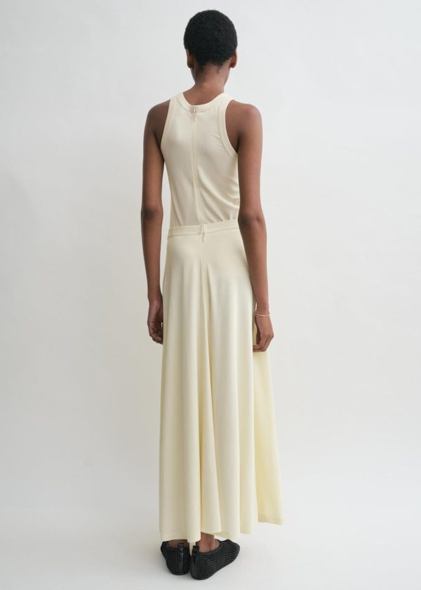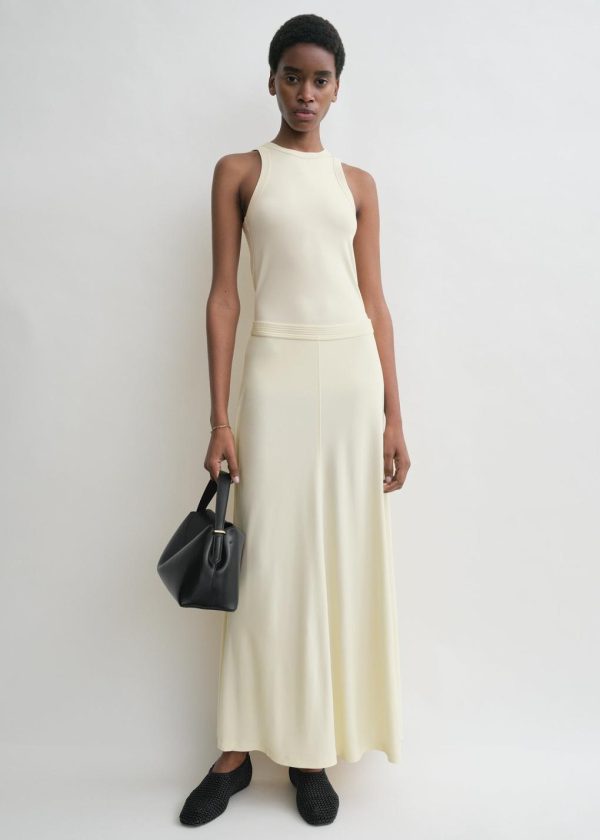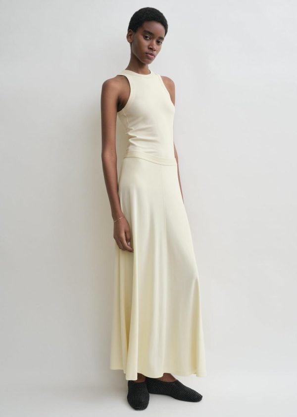 Fluid tank top inspired by TOTEME’s Curved seam tank. It is made from viscose jersey topstitched along the neck and armholes and fastened with a concealed back zipper. Team it with the matching skirt for a daytime event.